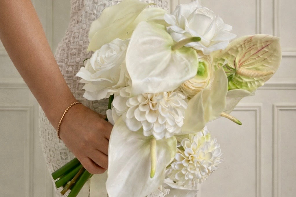 No - these are high-quality faux florals, chosen and arranged to look beautifully realistic. They won’t wilt, bruise, or fade, and can be kept long after the wedding day.