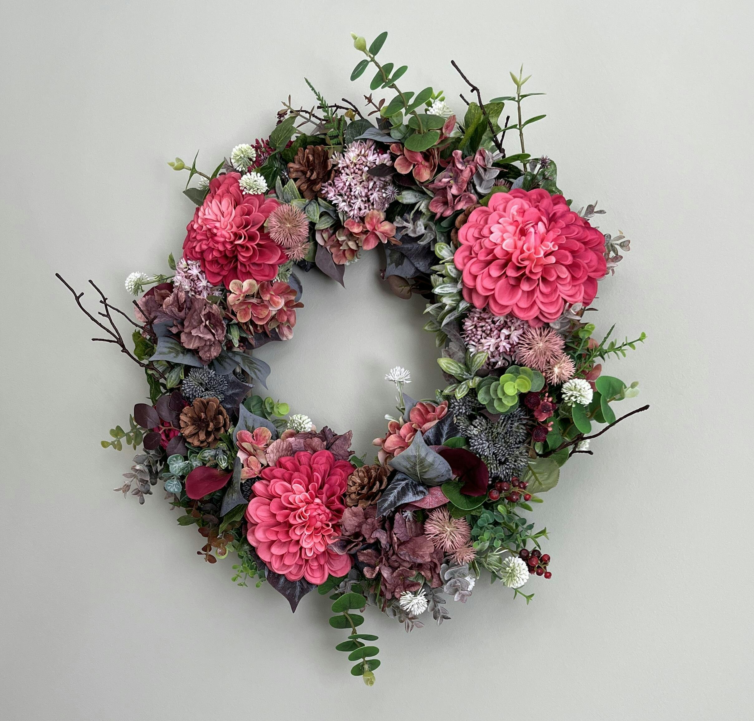 Measuring approx. 55cm, this faux flower wreath is full of high-quality silk flowers and artificial foliage arranged on a wicker wreath base. Whether you’re decorating for autumn, or simply embracing seasonal front door decor, this autumm door wreath makes a timeless statement.