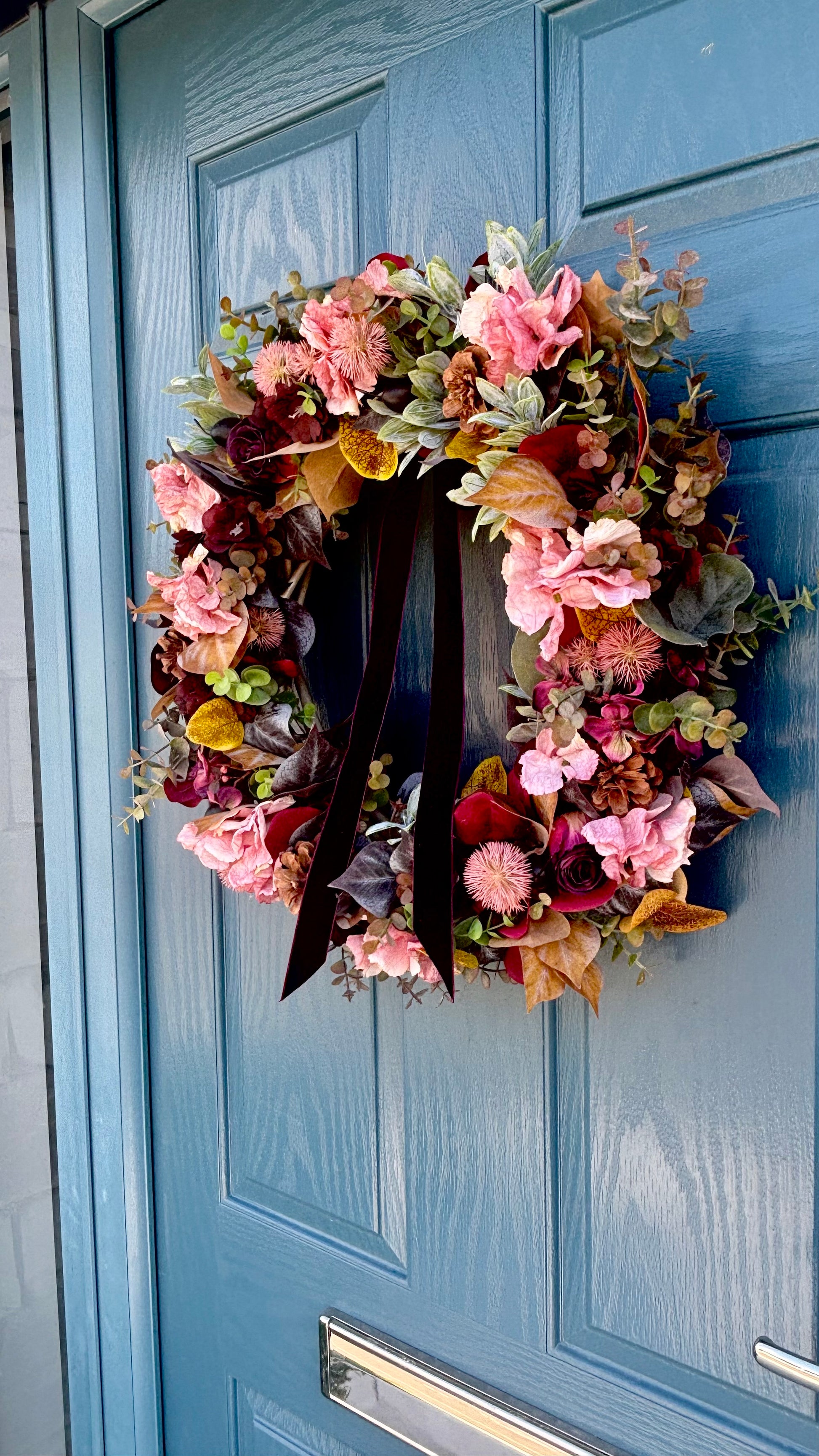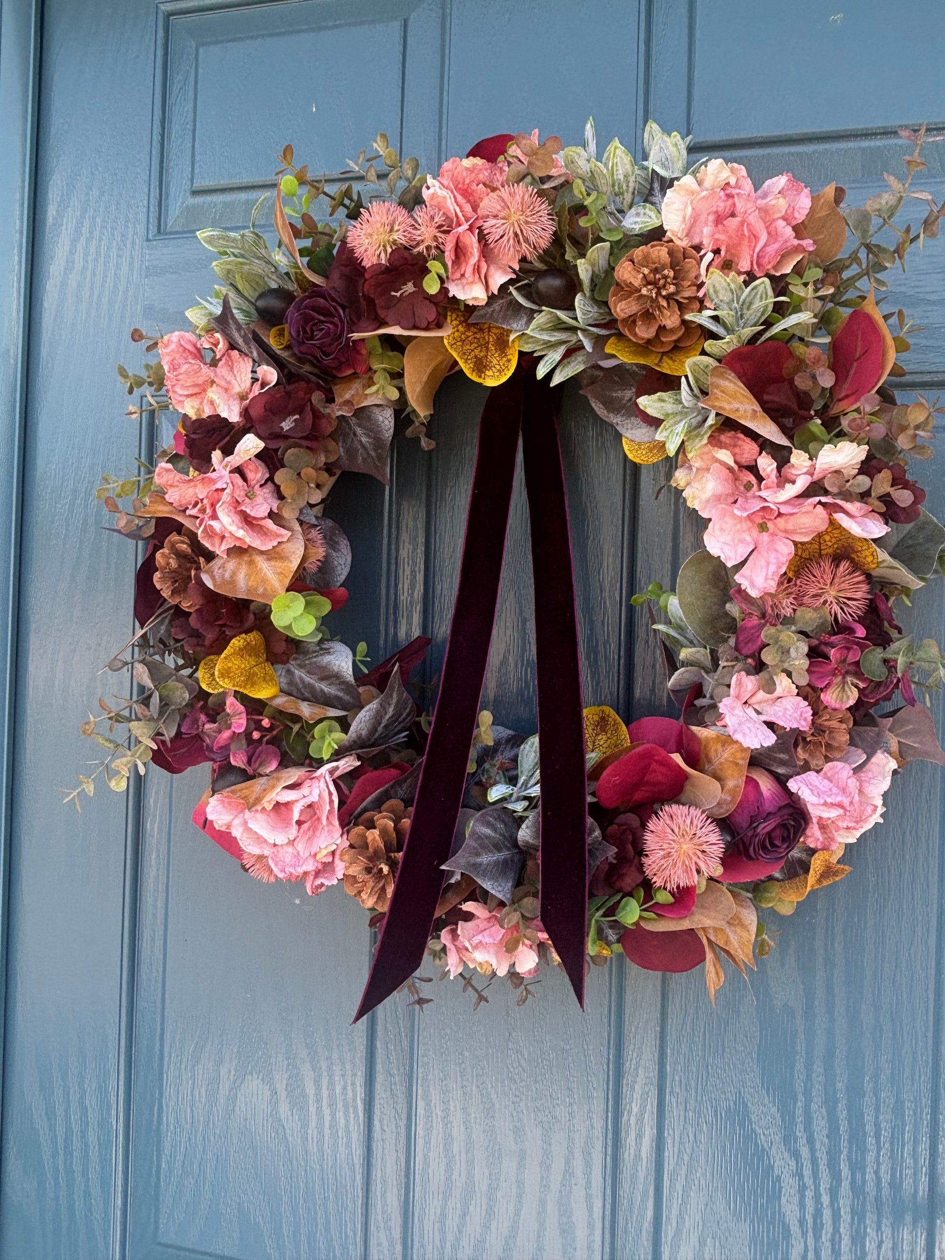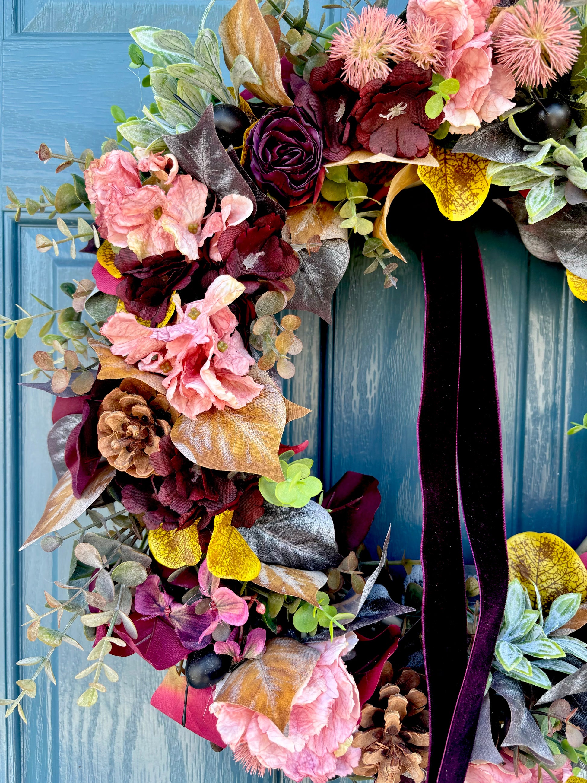 Bring the rich, cozy tones of the season to your home with our “Mulberry Fall” faux floral wreath — deep plum and berry-toned blooms are layered with textured foliage, soft mauves, and dusky greens, creating a lush, moody palette that captures the richness of the season.