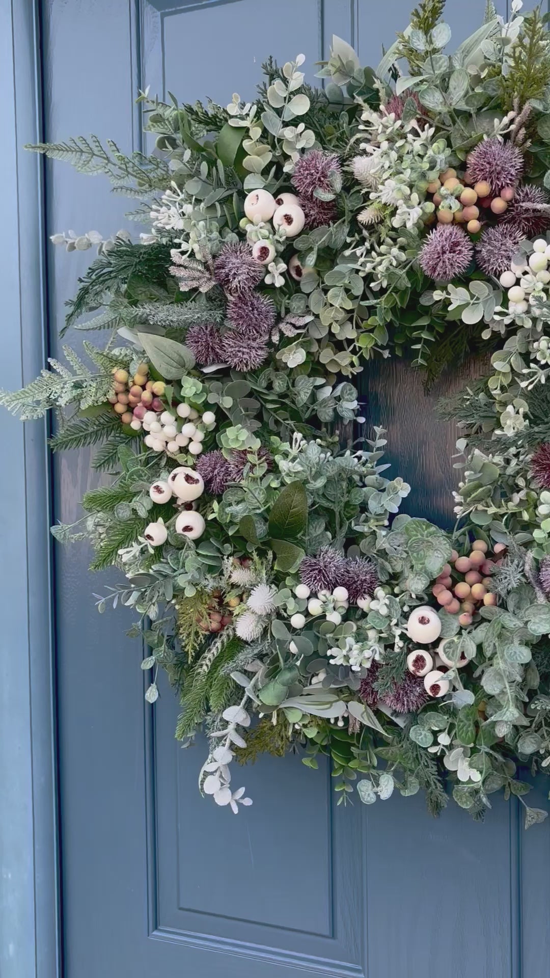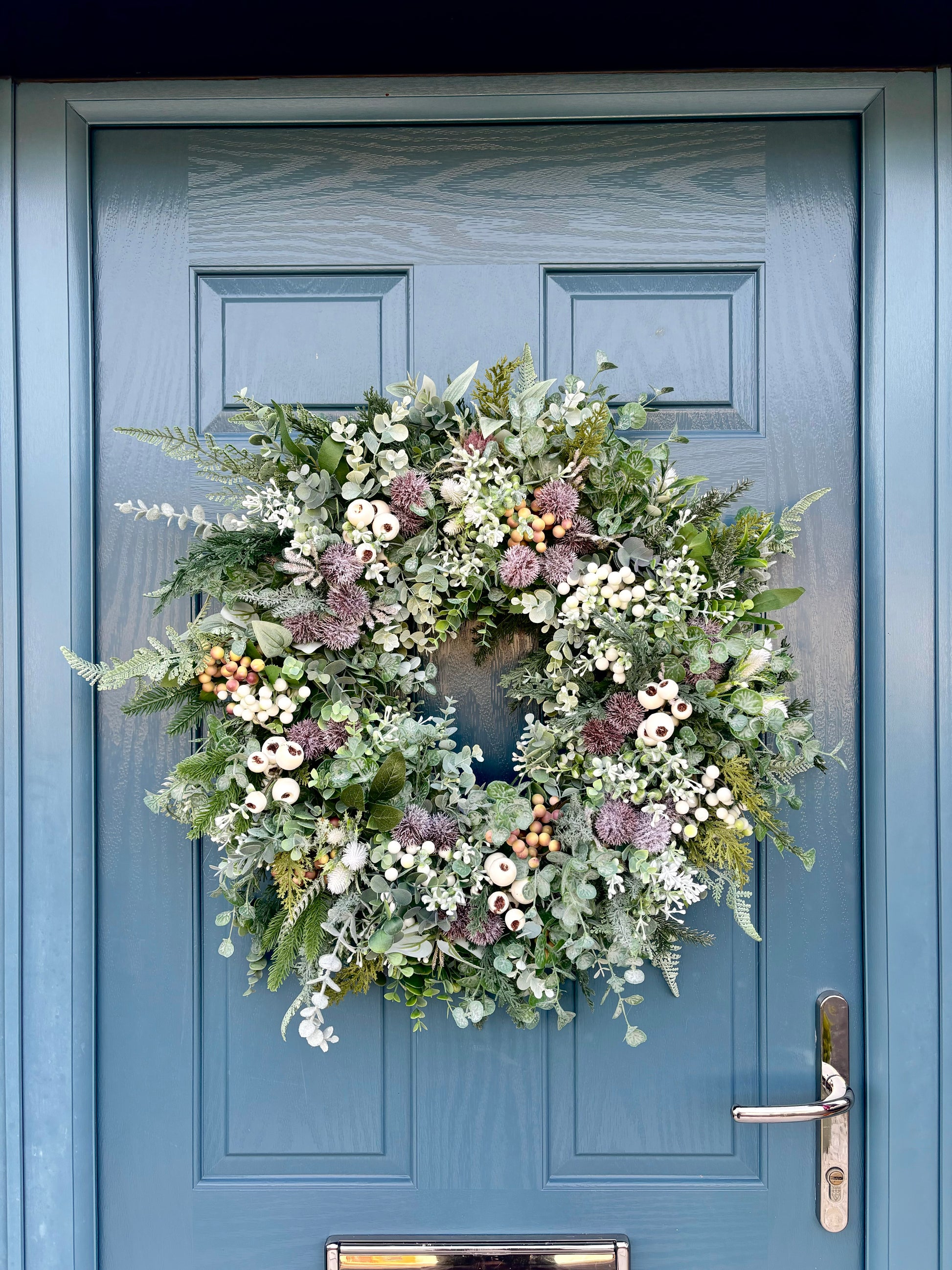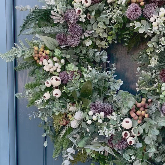 Bring a touch of winter calm to your door with The Thistle Frost - a full, textured wreath layered with ferns, eucalyptus, thistles, and berries in soft neutral tones.